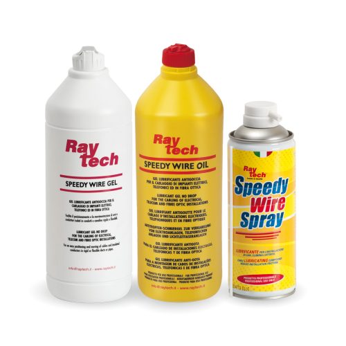 Lubricants for threading any kind of cable, power, telecom and optical fibre in ducts, smooth or corrugated piping, etc. With a very high lubrication power, especially when compared to products for similar uses, these are easily removable from cables, and require very low installation strenght, even in the case of bent conduits. Speedy Wire Oil is a standard, fluid and low viscosity lubricant. Speedy Wire Gel, thanks to its consistency, allows for savings of up to 3 times the amount used compared to other solutions. Speedy Wire Spray, thanks to its canister and dispensing nozzle, allows for suitable guiding of the lubricant, including inside piping and ducts, greatly facilitating application.